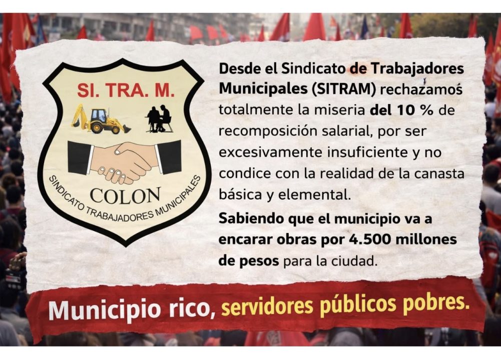 El Sindicato de Trabajadores Municipales (SITRAM) de la ciudad de Colón ha manifestado su firme rechazo a la reciente propuesta de recomposición salarial del 10 % presentada por el Ejecutivo local. A través de un comunicado oficial, la organización gremial calificó la cifra como «excesivamente insuficiente». Los argumentos del gremio Desde el SITRAM argumentan que […]